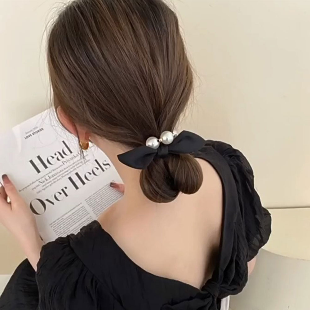 【追跡可能メール便】リボン パール ヘアゴム ヘアアクセサリー 髪ゴム おしゃれ りぼん 可愛い ヘアアレンジ 韓国 ポニーテール ブラック 黒 追跡可能 メール便